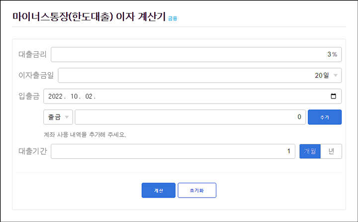 초기화를 누르면 처음으로 다시 세팅이 됩니다. 본 마이너스통장 금리 계산기가 마음에 드는 이유는 매달 얼마가 빠지게 될지 간단명료하게 보인다는 점 때문입니다.