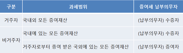 증여세는 받는 사람 즉 수증자가 증여시점에 거주자이냐 비거주자냐에 따라 납부의무자가 달라지는데요. 여기서 말하는 비거주자는 해외국적을 가진 사람을 의미합니다. 이를 정리해보면 아래와 같습니다.